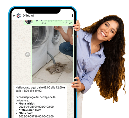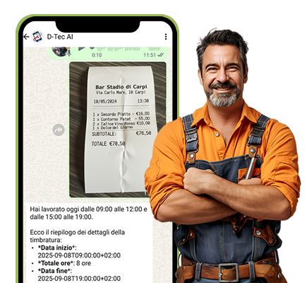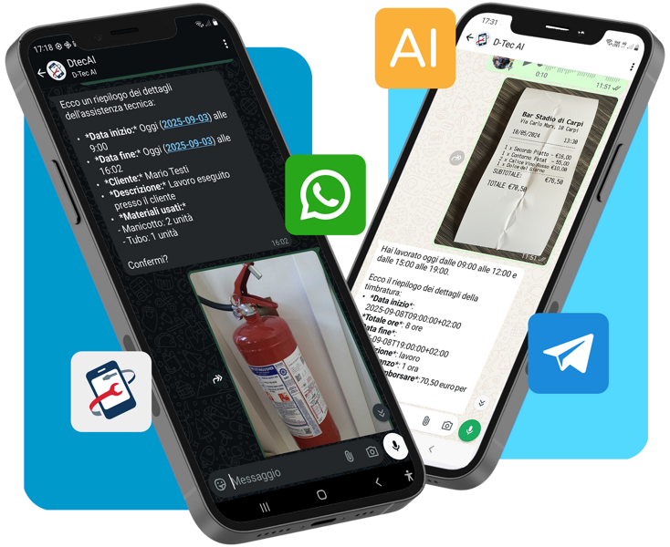 D-TEC è Il primo applicativo software in italia per le assistenze tecniche e la compilazione gli interventi tecnici in mobilità sul campo, ad essere un gestionale collegato a WhatsApp e Telegram, per l'inserimento vocale rapido delle informazioni che i tecnici, i dipendenti e gli operatori devono fornire giornalmente all'azienda. L'alternativa ai soliti software costosi e complessi: D-TEC con Intelligenza artificale AI rende le Squadre di tecnici operative sul campo presso i Clienti che comunicano già via WhatsApp o Telegram. Tecnici e capo squadra da adesso possono compilare al volo i loro rapportini di lavoro, note spese e timbrature via WhatsApp e l’AI di D-TEC in automatico prepara il rapportino e il foglio presenza dipendente.