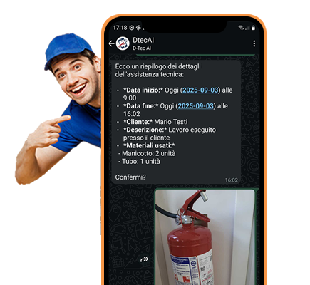 Parla su WhatsApp o Telegram e D-TEC compila il tuo rapportino in automatico. Anche i meno tecnologici lo usano con piacere. Facile, immediato, potente.